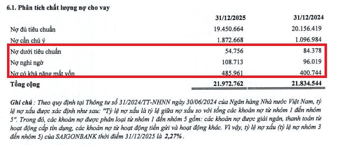 Đáng chú ý, chú tích theo BCTC, Saigonbank ghi chú: Theo quy định tại Thông tư số 31/2024/TT-NHNN ngày 30/06/2024 của Ngân hàng Nhà nước Việt Nam, tỷ lệ nợ xấu được xác định như sau: "Tỷ lệ nợ xấu là tỷ lệ giữa nợ xấu so với tổng các khoản nợ từ nhóm 1 đến nhóm 5". Trong đó, các khoản nợ được phân loại từ nhóm 1 đến nhóm 5 gồm: các khoản nợ được giải ngân, thanh toán từ hoạt động cấp tín dụng, các khoản nợ từ hoạt động tiền gửi và hoạt động khác. Vì vậy, tỷ lệ nợ xấu (tỷ lệ nợ nhóm 3 đến nhóm 5) của SaigonBank thời điểm 31/12/2025 là 2,27%.