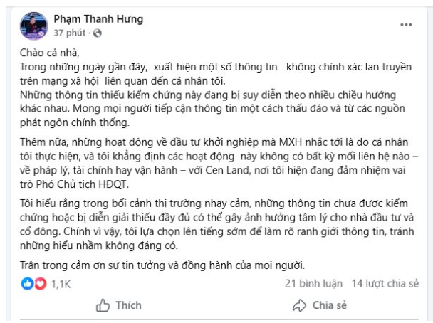 Thêm vào đó, ông Hưng cũng cho biết những hoạt động về đầu tư khởi nghiệp mà MXH nhắc tới là do cá nhân ông thực hiện, và đồng thời khẳng định các hoạt động này không có bất kỳ mối liên hệ nào – về pháp lý, tài chính hay vận hành – với Cen Land, nơi ông hiện đang đảm nhiệm vai trò Phó Chủ tịch HĐQT.