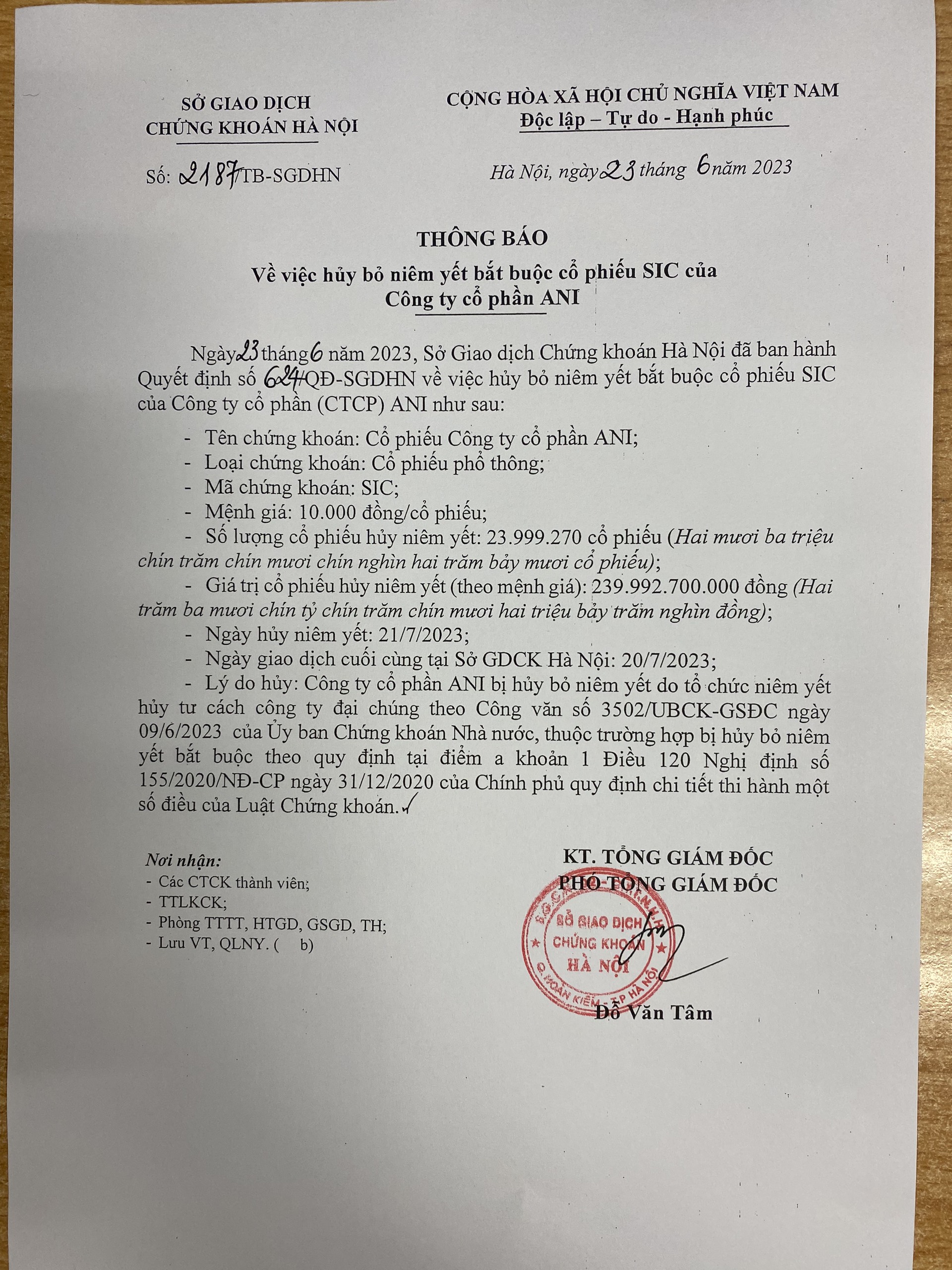 SIC: Ngày 21/07/2023, ngày hủy niêm yết cổ phiếu của CTCP ANI