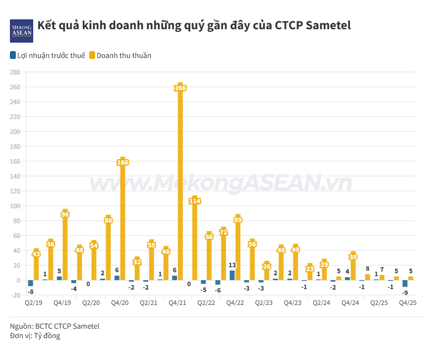 Lũy kế cả năm 2025, doanh thu thuần của Sametel đạt 24,7 tỷ đồng, giảm khoảng 75% so với năm 2024. Doanh nghiệp báo lỗ trước thuế 7,7 tỷ đồng, trong khi năm trước ghi nhận lợi nhuận trước thuế 1,4 tỷ đồng.