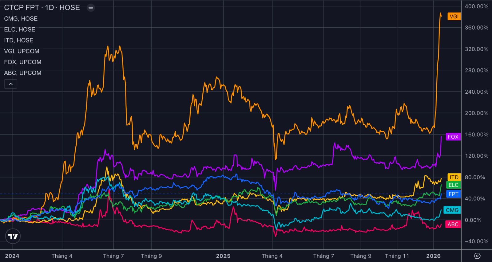 VGI là trường hợp hiếm hoi thuộc nhóm Công nghệ - Viễn thông điều chỉnh giảm trong phiên 16/1. Tuy nhiên, cổ phiếu này trước đó đã có nhịp tăng rất nóng cùng sóng doanh nghiệp có vốn Nhà nước. Tính từ đầu năm 2026 đến nay, VGI đã tăng hơn 75% thị giá. Vốn hóa thị trường xấp xỉ 380.000 tỷ đồng, nằm trong top 5 toàn sàn chứng khoán.