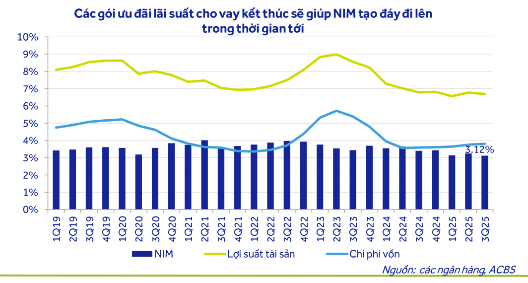 Đánh giá xu hướng NIM năm 2026, Chứng khoán ACBS cho rằng, đà giảm NIM đã chậm lại trong hai quý gần nhất và nhiều khả năng sẽ cải thiện trong quý IV/2025 khi các ngân hàng sử dụng hết room tín dụng và lãi suất cho vay tăng mạnh.