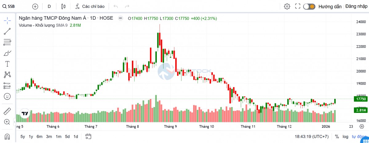Trên thị trường chứng khoán, chốt phiên giao dịch ngày 12/1, cổ phiếu SSB đóng cửa tại 17.750 đồng/cổ phiếu, tăng 400 đồng tương đương 2,31%, đảo chiều so với mức giảm nhẹ 0,29% trong phiên 09/01. Thanh khoản cũng cải thiện đáng kể khi khối lượng khớp lệnh đạt gần 2,81 triệu đơn vị, tăng khoảng 34% so với hơn 2,09 triệu cổ phiếu của phiên trước đó.