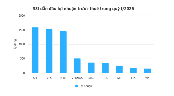SSI ghi nhận lợi nhuận trước thuế 1.593 tỷ đồng trong quý I/2026, dẫn đầu trong các công ty chứng khoán đã công bố thông tin.