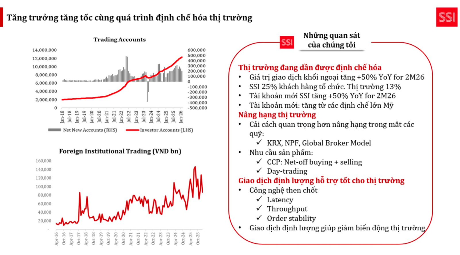 Riêng tại SSI, số tài khoản tổ chức mở mới tăng 52%, với khoảng 30% doanh thu đến từ nhóm này, chủ yếu là các định chế nước ngoài. Các tài khoản mới ngày càng đến từ các tổ chức lớn tại Mỹ, được thúc đẩy bởi kỳ vọng nâng hạng thị trường và các cải cách như áp dụng mã giao dịch điện tử, bãi bỏ yêu cầu hợp pháp hóa lãnh sự.