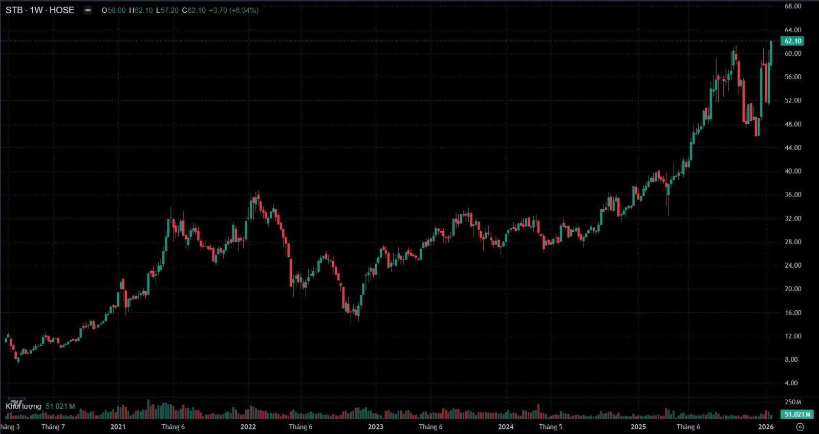 Cổ phiếu STB phản ứng tích cực với thông báo của Sacombank, khi tăng kịch biên độ “trắng bên bán” trong phiên 21/1, dư mua giá trần hàng triệu đơn vị bất chấp thị trường điều chỉnh. Chỉ trong vòng hơn 1 tháng trở lại đây, thị giá STB đã tăng gần 35% qua đó lập đỉnh mới 62.100 đồng/cp. Vốn hóa thị trường cũng theo đó lập kỷ lục 117.000 tỷ đồng.
