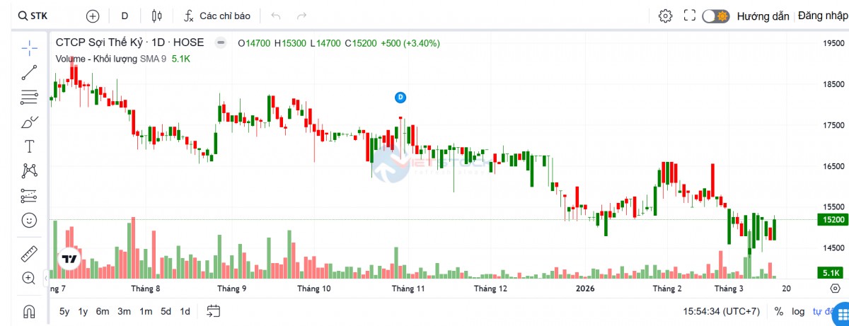 Trên thị trường chứng khoán, chốt phiên giao dịch ngày 17/3, cổ phiếu STK ghi nhận diễn biến tích cực khi tăng 500 đồng, tương ứng 3,4%, lên mức 15.200 đồng/cp, đảo chiều so với phiên giảm gần 3% trước đó. Tuy nhiên, thanh khoản lại sụt giảm mạnh, chỉ đạt 5.100 cổ phiếu, thấp hơn đáng kể so với mức 41.600 cổ phiếu của phiên 16/3.