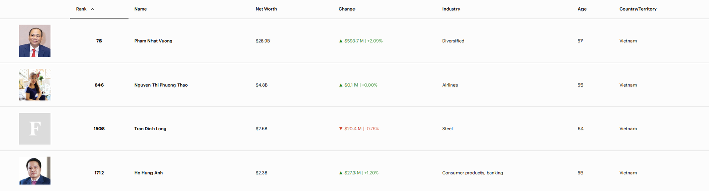 Như vậy, đến cuối năm 2025, Việt Nam có 5 tỷ phú USD, gồm ông Phạm Nhật Vượng, bà Nguyễn Thị Phương Thảo, ông Trần Đình Long, ông Hồ Hùng Anh và ông Nguyễn Đăng Quang. Ông Trần Bá Dương không còn xuất hiện trong danh sách.