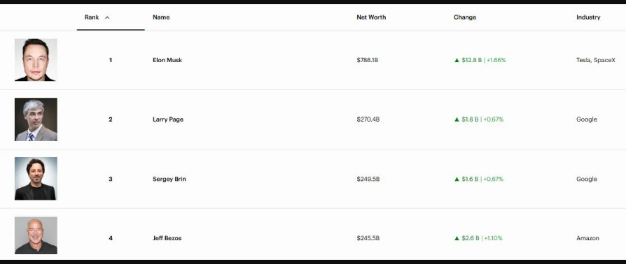 Theo đó, hiện tỷ phú Elon Musk sở hữu khối tài sản lên tới 788,1 tỷ USD, tiếp tục củng cố vị trí giàu nhất thế giới. Xếp ngay sau tỷ phú Musk là hai nhà đồng sáng lập Google Larry Page với khối tài sản 270,4 tỷ USD và Sergey Brin với 249,5 tỷ USD, lần lượt giữ vị trí thứ hai và thứ ba trong bảng xếp hạng những người giàu nhất hành tinh.