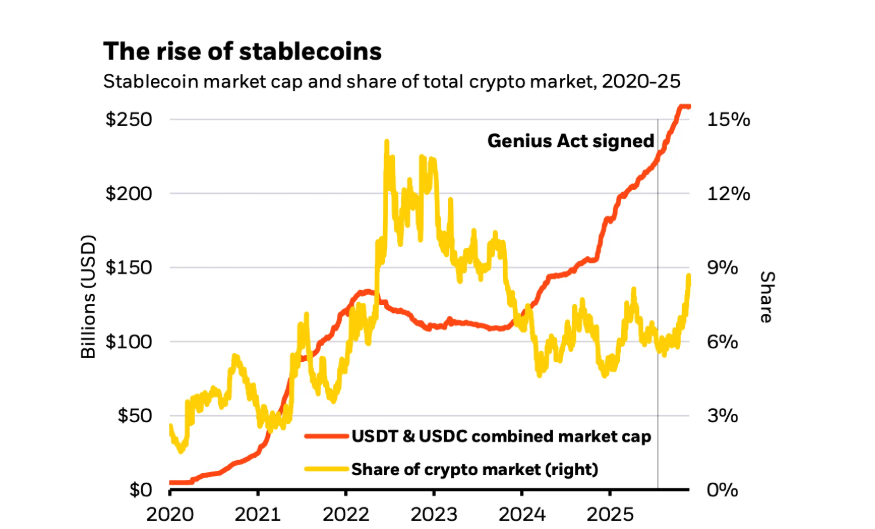 Quan điểm này cũng được BlackRock nhấn mạnh trong báo cáo “2026 Global Outlook”. Theo tập đoàn quản lý tài sản lớn nhất thế giới, stablecoin đang chuyển mình từ một công cụ gắn chặt với thị trường tiền mã hóa sang vai trò trung gian giữa tài chính số và tài chính truyền thống. Đến cuối tháng 11/2025, vốn hóa thị trường stablecoin đã vượt 250 tỷ USD, phản ánh mức độ chấp nhận ngày càng rộng rãi trong thanh toán, từ giao dịch crypto đến chuyển tiền xuyên biên giới.
