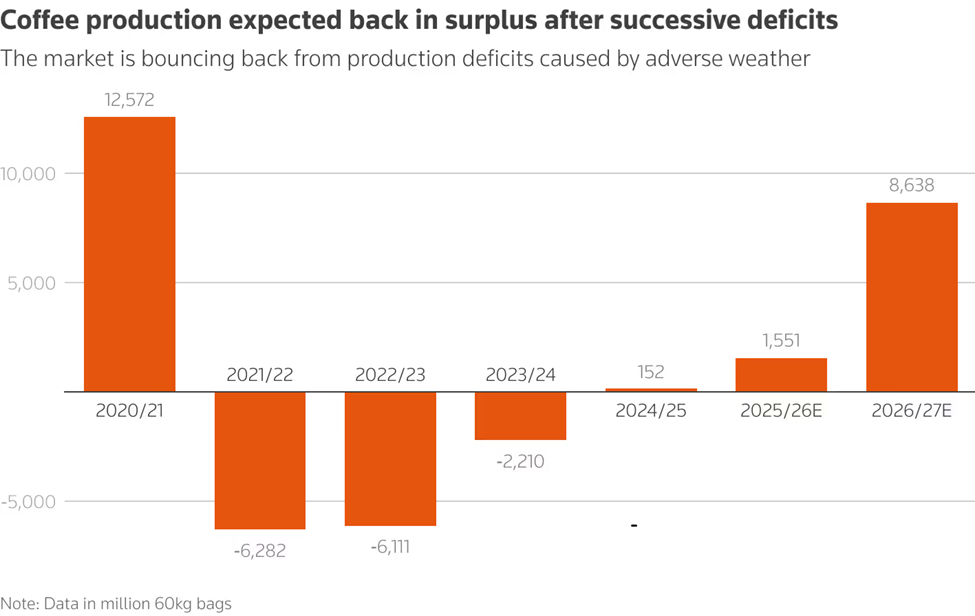 Thủ phạm thực sự bắt nguồn từ trước đó rất lâu: tình trạng thiếu hụt nguồn cung cà phê hạt thô nghiêm trọng, kết quả của ba mùa vụ thâm hụt sản lượng liên tiếp do thời tiết bất lợi. Tình trạng này đã khiến giá hạt thô tăng gấp đôi trong 12 tháng tính đến tháng 3 và tác động của nó vẫn đang lan truyền trong chuỗi cung ứng.