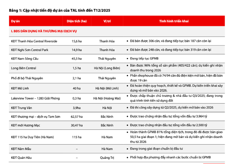 VCBS cũng cho biết trong năm 2025, Taseco Land đã hoàn tất nghĩa vụ nộp tiền sử dụng đất cho một phần Khu đô thị Duy Tiên (hơn 1.600 tỷ đồng) và dự án Phố đi bộ Thái Nguyên (hơn 1.300 tỷ đồng). Trong năm 2026, doanh nghiệp tiếp tục thực hiện các nghĩa vụ tài chính tại Trung Văn, Mê Linh, phần còn lại của Duy Tiên và chi phí giải phóng mặt bằng Khu công nghiệp Duy Tiên.