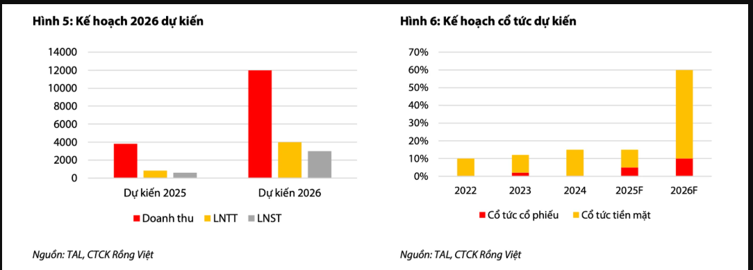 Liên quan đến kế hoạch kinh doanh năm 2026, VDSC cho biết Taseco Land có thể điều chỉnh chính sách cổ tức từ năm 2026 theo hướng “trả cổ tức bằng tiền mặt kết hợp cổ phiếu ở mức hợp lý”. Nếu doanh nghiệp tiến hành chi trả cổ tức bằng tiền mặt, đây sẽ là yếu tố khiến cổ phiếu TAL trở nên hấp dẫn hơn trong mắt nhà đầu tư dài hạn. Định hướng mới giúp doanh nghiệp duy trì sự cân bằng giữa lợi ích cổ đông và nhu cầu bổ sung vốn cho giai đoạn tăng trưởng mạnh dự kiến kéo dài từ 2026–2030.
