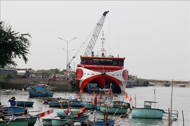 Các tàu cao tốc hoạt động tuyến Phan Thiết - đảo Phú Quý neo đậu trong cảng Thương Chánh (Lâm Đồng). Ảnh: Nguyễn Thanh/TTXVN