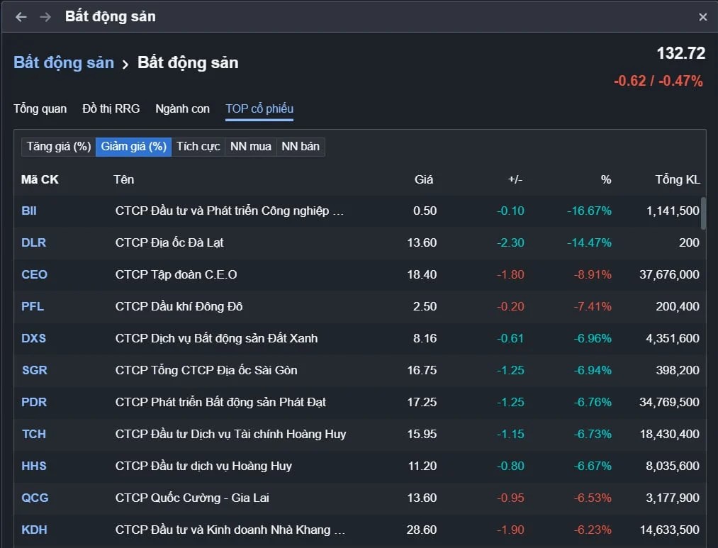 Trái ngược với bức tranh tích cực của ngân hàng, nhóm bất động sản trở thành tâm điểm điều chỉnh trong phiên. Loạt cổ phiếu địa ốc giảm sâu, thủng đáy, trong đó có tới 7 mã ghi nhận mức giá sàn như PDR, TCH, DXS, SGR…, kéo mặt bằng chung của nhóm này xuống mức thấp nhất trong nhiều phiên.