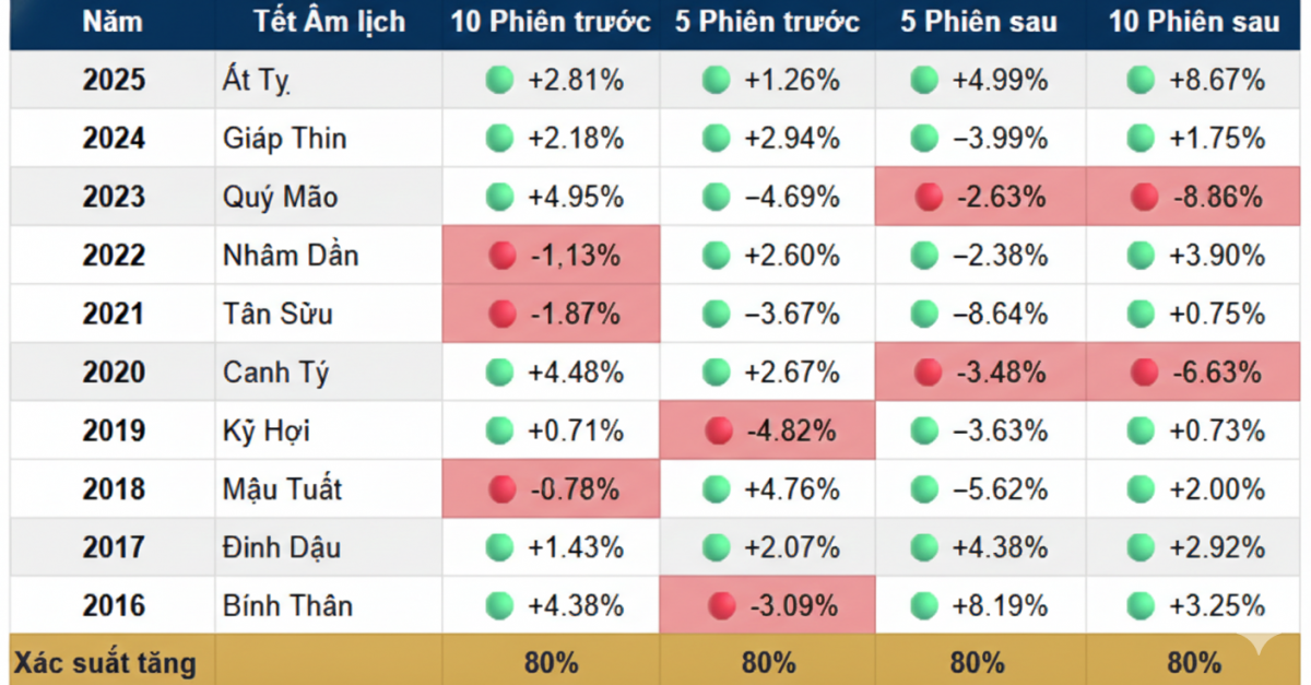 Nếu mở rộng khung thời gian lên 10 phiên sau Tết, xác suất tăng vẫn duy trì ở mức 80%. Những năm ghi nhận biên độ tăng mạnh gồm 2019 (+8,83%), 2021 (+6,43%), 2018 (+5,71%), 2024 (+4,67%) và 2016 (+3,92%).