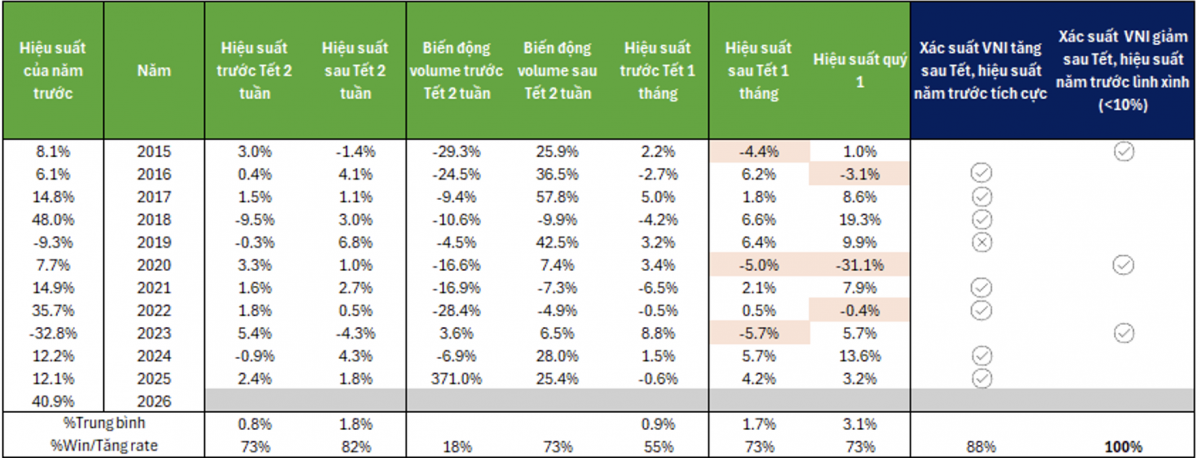 Thống kê hiệu suất VN-Index trước và sau Tết. Nguồn: Kafi
