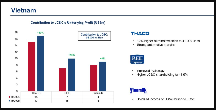 Về kết quả kinh doanh, báo cáo tài chính bán niên 2025 của JC&C ghi nhận lợi nhuận đóng góp từ thị trường Việt Nam đạt 36 triệu USD, tăng 17% so với cùng kỳ năm trước. Trong đó, THACO đóng góp 17 triệu USD (tăng 10%) nhờ doanh số ô tô đạt 41.000 xe và biên lợi nhuận cải thiện. REE đóng góp 10 triệu USD (tăng 48%), chủ yếu do điều kiện thủy văn thuận lợi hỗ trợ mảng thủy điện, Vinamilk đóng góp 9 triệu USD từ cổ tức.