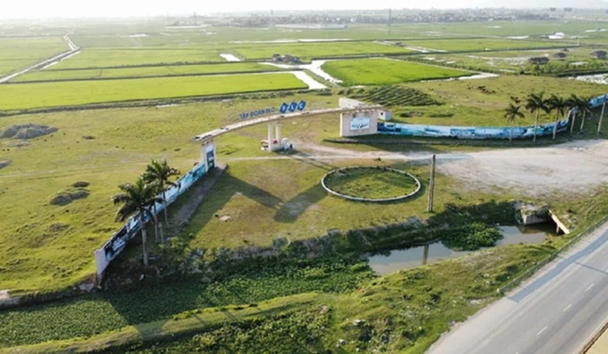 Khu đất trước đây Tập đoàn FLC được UBND tỉnh Thanh Hóa giao đầu tư Khu công nghiệp FLC Hoàng Long nhưng sau đó "chết yểu" (ảnh chụp tháng 4-2022, khi cổng chào chưa tháo dỡ)