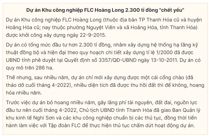Trong văn bản, Tập đoàn FLC cho biết trước đây đơn vị đã được UBND tỉnh Thanh Hóa giao làm chủ đầu tư thực hiện Dự án Đầu tư xây dựng, quản lý và kinh doanh hạ tầng Khu công nghiệp Hoàng Long thuộc nhiều xã, phường của TP Thanh Hóa cũ và huyện Hoằng Hóa cũ.