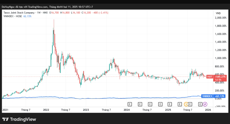 Trên thị trường chứng khoán, cổ phiếu HUT từng trải qua biến động mạnh trong giai đoạn doanh nghiệp thực hiện tái cấu trúc. Tuy nhiên, khi các chỉ số tài chính dần cải thiện và mô hình “3 chân” được định hình, cổ phiếu đã ghi nhận sự quan tâm trở lại từ nhà đầu tư. Thanh khoản có xu hướng tăng, phản ánh kỳ vọng rằng Tasco đang bước vào chu kỳ tăng trưởng mới với mô hình kinh doanh đa mảng và hướng mở rộng rõ ràng. Nếu xét trong 5 năm, cổ phiếu HUT đạt mức tăng hơn 545%.