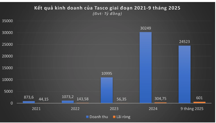 Đi cùng với hoạt động tái cấu trúc, kết quả kinh doanh của Tasco (giai đoạn 2021-9 tháng năm 2025) cũng cho thấy sự tăng trưởng vượt bậc.