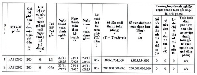 Theo đó, ngày 24/11/2025 vừa qua, Pan Farm đã hoàn thành việc thanh toán 200 tỷ đồng tiền gốc và gần 8,1 tỷ đồng tiền lãi tại ngày đáo hạn cho lô trái phiếu mã PAF12303 (PAFCH2325003).