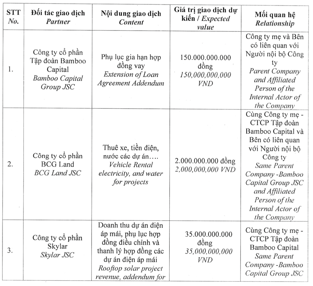 Cụ thể, Tracodi dự kiến gia hạn hợp đồng vay với CTCP Tập đoàn Bamboo Capital, giá trị 150 tỷ đồng. Với CTCP BCG Land, doanh nghiệp sẽ thực hiện các giao dịch liên quan đến thuê xe, chi phí điện, nước phục vụ dự án với tổng giá trị khoảng 2 tỷ đồng. CTCP Skylar được phê duyệt các giao dịch phát sinh doanh thu từ dự án điện áp mái và phụ lục hợp đồng, tổng giá trị 35 tỷ đồng.