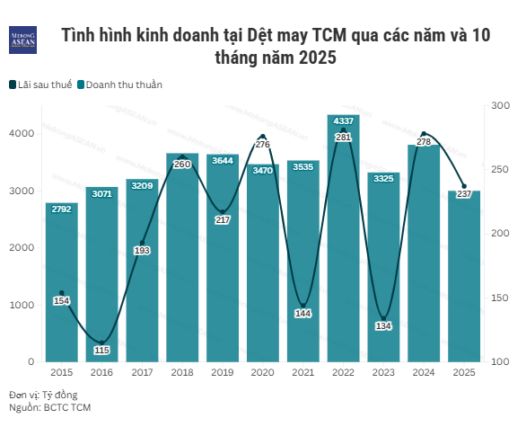 Lũy kế 10 tháng năm 2025, TCM đạt doanh thu 3.002 tỷ đồng, giảm 5% so với cùng kỳ và hoàn thành hơn 66% kế hoạch năm. Lãi sau thuế đạt 237 tỷ đồng, giảm 2%, tương đương 85% mục tiêu đề ra.