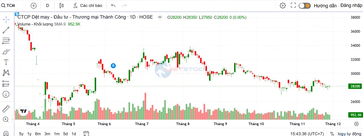 Trên thị trường chứng khoán, chốt phiên giao dịch ngày 27/11, cổ phiếu TCM giữ nguyên mức giá 28.200 đồng, không thay đổi so với phiên 26/11. Thanh khoản giảm nhẹ xuống còn 952.500 đơn vị so với hơn 1,08 triệu đơn vị của phiên trước.