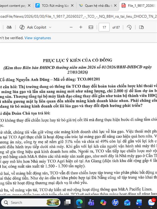 Ngày 03/04/2026, Công ty Cổ phần TCO Holdings thông báo điều chỉnh nội dung đăng ký doanh nghiệp, loại bỏ lúa gạo ra khỏi danh mục ngành nghề kinh doanh cốt lõi. Doanh nghiệp xác định lĩnh vực chính mới là tư vấn quản lý kinh doanh. Trả lời chất vấn của cổ đông tại Đại hội đồng cổ đông thường niên ngày 27/03/2026 về việc từ bỏ lĩnh vực nông nghiệp, đại diện TCO khẳng định doanh nghiệp không thay đổi chiến lược cốt lõi.