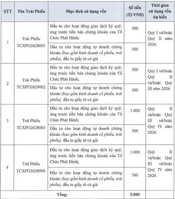 Đồng thời, công ty cũng lùi thời gian phát hành dự kiến của từng đợt. Trong đó, đợt 1 (mã TCXPO2628001) dự kiến phát hành trong quý I-II/2026, sau khi được Ủy ban Chứng khoán Nhà nước chấp thuận.