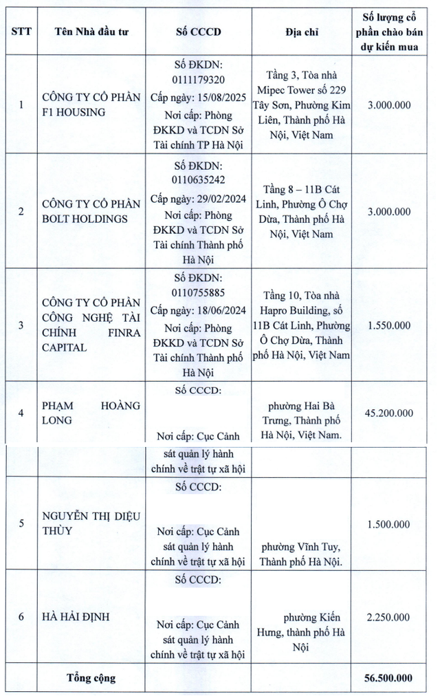 6 nhà đầu tư dự kiến tham gia đợt chào bán cổ phiếu riêng lẻ. Nguồn: Textaco