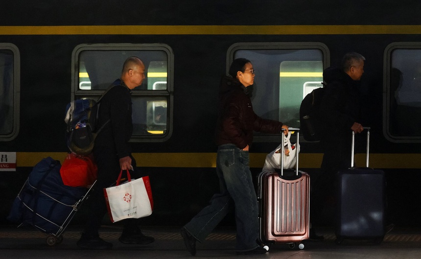 Du khách đi bộ dọc theo sân ga cạnh một đoàn tàu tại ga tàu Bắc Kinh (Trung Quốc) trong cao điểm Tết Nguyên đán, ngày 12/2. Ảnh: Reuters.