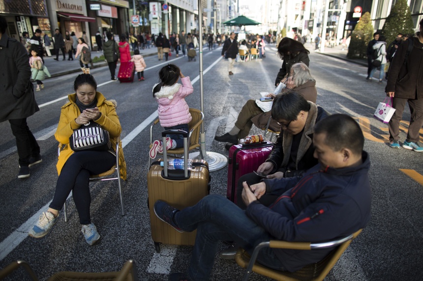 Du khách Trung Quốc thư giãn tại khu phố đi bộ ở quận Ginza, Tokyo, Nhật Bản, năm 2019. Ảnh: Bloomberg.