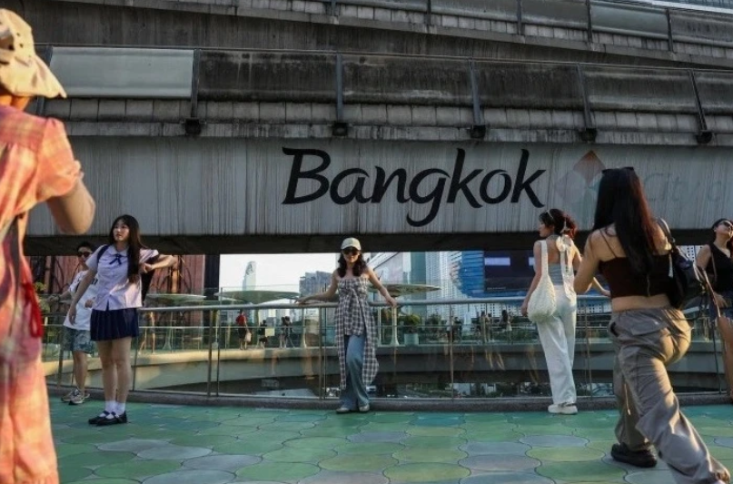 Du khách Trung Quốc chụp ảnh trên cầu vượt ở Bangkok năm 2024. Ảnh: Reuters.