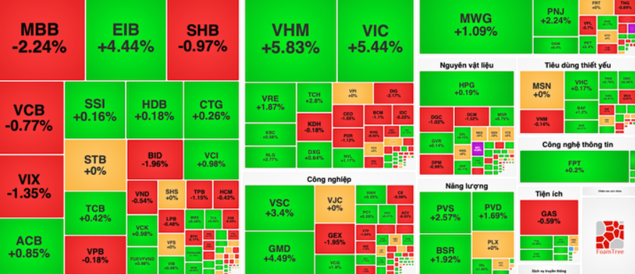 Theo thống kê, riêng VIC đóng góp hơn 14 điểm cho VN-Index, VHM đóng góp gần 5,5 điểm - trở thành hai mã tác động tích cực nhất đến chỉ số. Ngoài ra, BSR đóng góp 0,48 điểm, EIB đóng góp 0,39 điểm và MWG đóng góp 0,31 điểm.