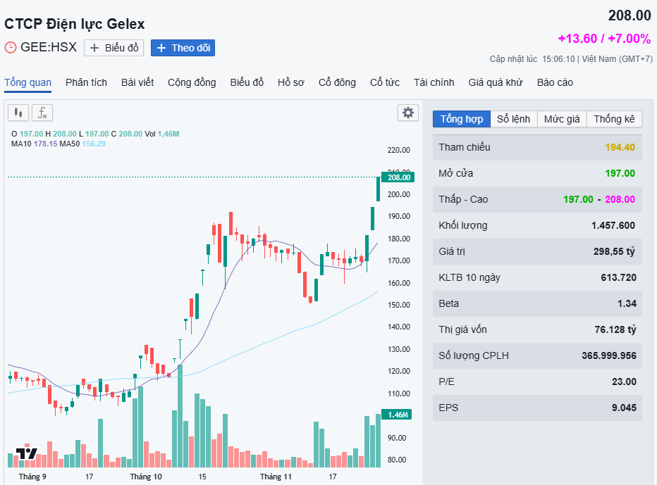 Hiện, vốn hoá thị trường của Gelex Electric tăng mạnh lên mức hơn 76.127 tỷ đồng.