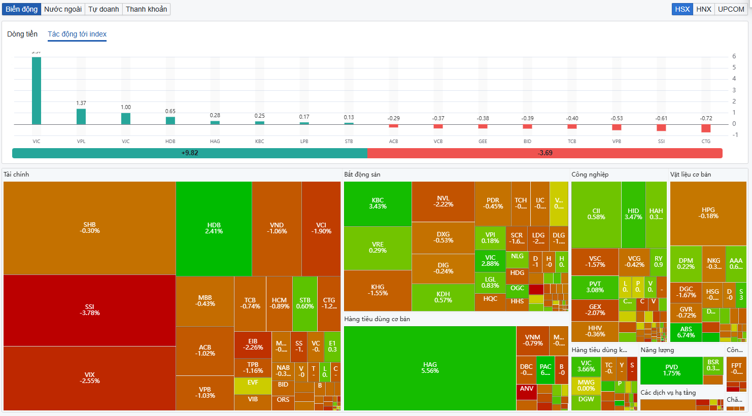 Rổ VN30 cũng cho thấy sự suy yếu khi chỉ có 7 mã tăng, trong khi 20 mã giảm và 3 mã đứng giá. VJC tăng 3,66% và VIC tăng 2,88%, trở thành hai cổ phiếu nâng đỡ thị trường mạnh nhất. Ngược lại, nhiều mã giảm sâu như SSI giảm 3,63%, còn VPB, SSB, DGC, CTG, BCM, ACB… đều giảm hơn 1%.