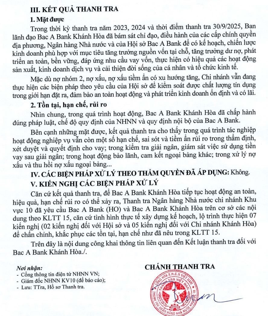 Căn cứ kết quả thanh tra, Thanh tra Ngân hàng Nhà nước chi nhánh Khu vực 10 đã yêu cầu Bac A Bank hội sở (HO) và Bac A Bank Khánh Hòa trên cơ sở các nội dung theo KLTT 15 căn cứ tình hình thực tế xây dựng kế hoạch, lộ trình thực hiện 07 kiến nghị (02 kiến nghị đối với Hội sở và 05 kiến nghị đối với Chi nhánh Khánh Hòa) để chấn chỉnh, khắc phục các tồn tại, hạn chế như đã nêu trong KLTT 15.