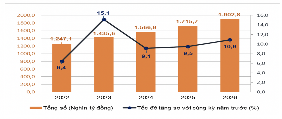 Tổng mức bán lẻ hàng hoá và doanh thu dịch vụ tiêu dùng theo giá hiện hành quý I, giai đoạn 2022 - 2026.