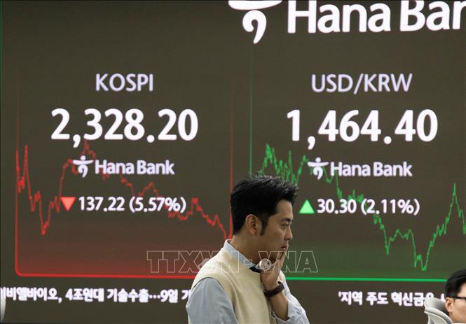 Bảng điện tử hiển thị chỉ số chứng khoán KOSPI tại ngân hàng Hana ở Seoul, Hàn Quốc ngày 7/4/2025. Ảnh: THX/TTXVN