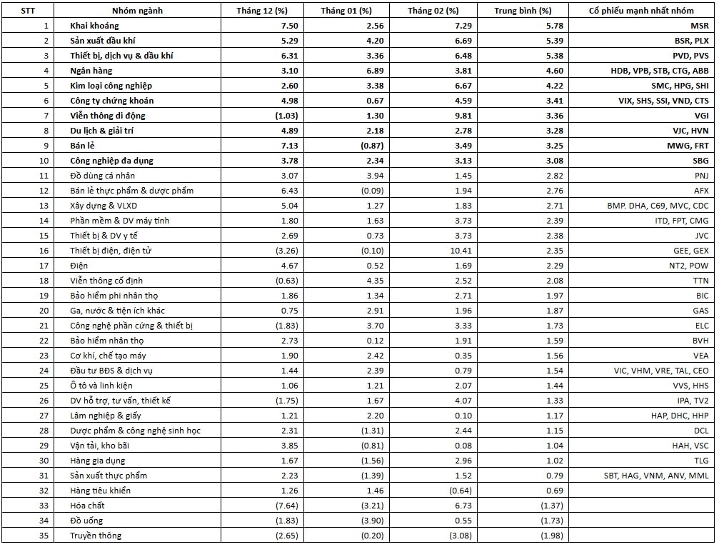 Nhóm dẫn đầu (Top 5): Khai khoáng, Dầu khí và Ngân hàng là những "ngôi sao" thực sự trong giai đoạn này. Đặc biệt Ngân hàng có sự bứt phá mạnh nhất vào tháng 1, trong khi Dầu khí và Khai khoáng duy trì phong độ cực tốt xuyên suốt cả 3 tháng.