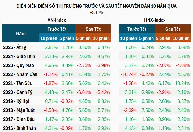 Dữ liệu của VietstockFinance trong giai đoạn 2016 – 2025 cho thấy, chỉ số VN-Index có 8 lần tăng điểm trong 5 phiên và 10 phiên giao dịch đầu tiên sau Tết, ngoại trừ hai năm 2020 và 2023.