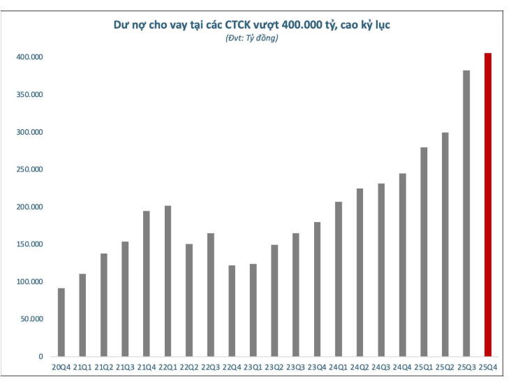 Theo thống kê, tổng giá trị cho vay ký quỹ (margin) của toàn ngành chứng khoán Việt Nam vượt mốc 400.000 tỷ đồng tại thời điểm 31/12/2025, tăng khoảng 23.000 tỷ dồng so với thời điểm cuối quý 3/2025 và thiết lập kỷ lục margin mới trong lịch sử hơn 25 năm của TTCK Việt Nam.