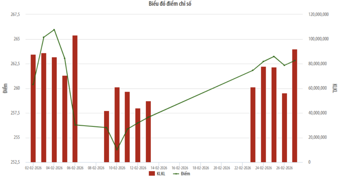 Trong tháng 2/2026, thị trường chứng khoán có kỳ nghỉ Tết nguyên đán nên thị trường cổ phiếu niêm yết HNX chỉ diễn ra 15 phiên giao dịch. Tuy nhiên, diễn biến giá cổ phiếu có nhiều biến động mạnh. Chỉ số giá HNX Index giảm mạnh trong gần 2 tuần đầu trước kỳ nghỉ Tết và có xu hướng phục hồi trong thời gian còn lại của tháng, giúp chỉ số này đóng cửa phiên giao dịch cuối tháng ở mức 262,82 điểm, tăng 2,61% so với tháng trước.