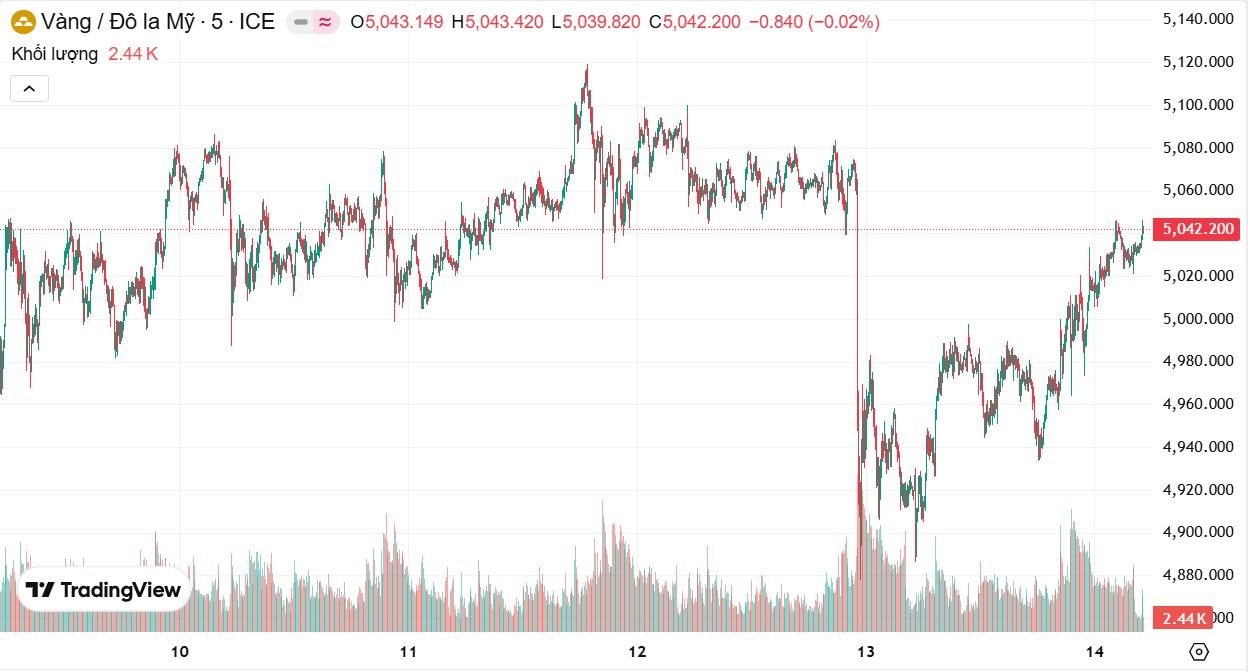 Giá vàng thế giới giao dịch quanh 5.041,2 USD/ounce, thấp hơn đáng kể so với mức trên 5.100 USD trước đó. Giá vàng tương lai Mỹ giao tháng 4 giảm 0,3% xuống 5.084,30 USD/ounce.