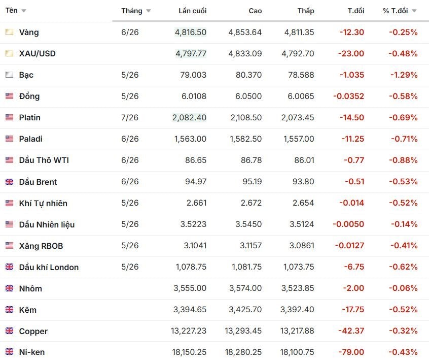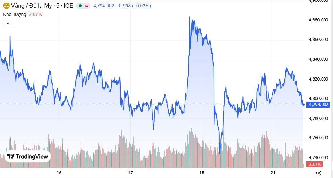 Giá vàng giao ngay giảm 0,2% xuống 4.807,91 USD/ounce, trong khi vàng kỳ hạn tháng 6 ổn định ở 4.827,30 USD. Đồng USD mạnh lên làm giảm sức hấp dẫn của kim loại quý.