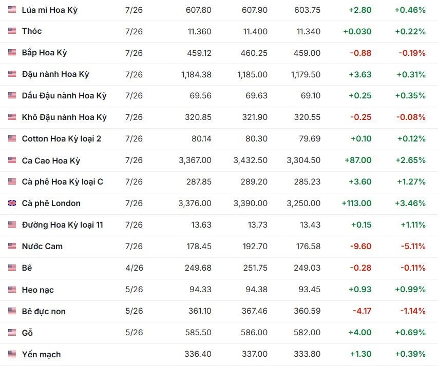 Giá cà phê cũng bật tăng mạnh do lo ngại nguồn cung. Robusta kỳ hạn tháng 5/2026 trên sàn London tăng 2,77% lên 3.482 USD/tấn, còn arabica tại New York tăng 1% lên 292,2 US cent/pound. Tồn kho robusta giảm xuống mức thấp nhất 16 tháng (3.788 lô), trong khi thời tiết khô hạn tại Brazil và nguy cơ El Niño tại Đông Nam Á tiếp tục hỗ trợ giá.