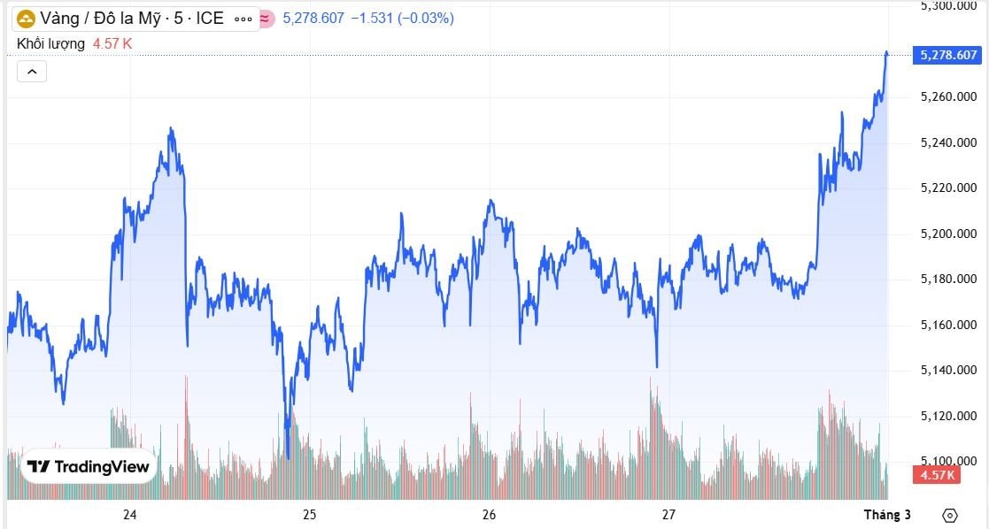 Giá vàng giao ngay tăng lên 5.230,56 USD/ounce, mức cao nhất kể từ ngày 30/1, và đã tăng 7,6% trong tháng. Hợp đồng vàng kỳ hạn tháng 4 tại Mỹ tăng 1% lên 5.247,90 USD. Thị trường đang hướng tới tháng tăng thứ 7 liên tiếp của kim loại quý.